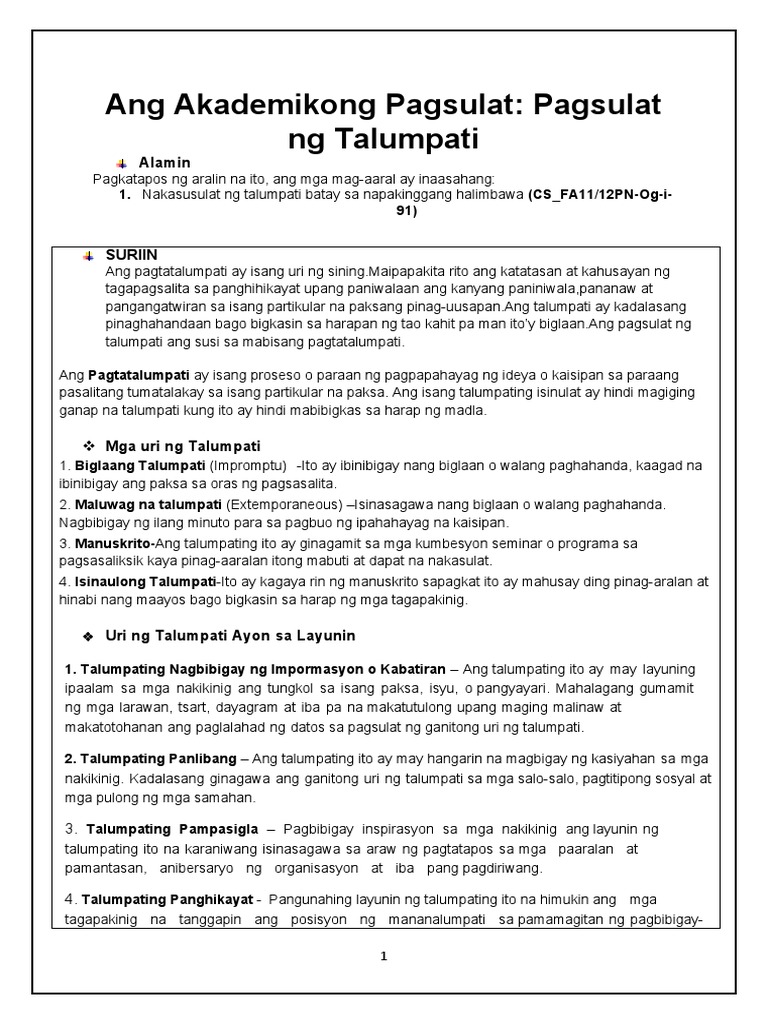 Maaaring pagkunan ng mga impormasyon ay ang dating kaalaman at mga karansan na may kinalaman sa paksa mga babasahing kaugnay ng paksa mga awtoridad sa paksang. Pagsulat ng Talumpati Ang pagtatalumpati ay isang proseso o paraan ng pagpapahayag ng ideya o kaisipan sa paraang pasalitang tumatalakay sa isang partikular na paksa. 552016 Pagsulat ng talumpati 1.