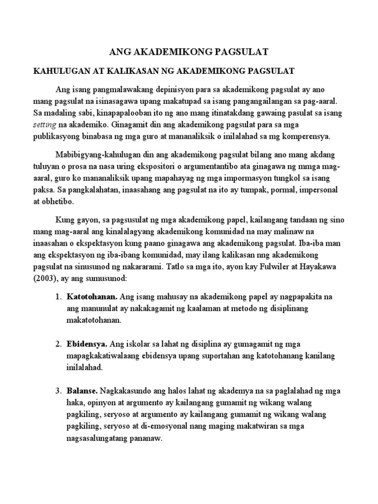 Halimbawa nito ay pagsulat ng proposal o konseptong papel editoryal sanaysay at talumpati na may layuning. Hindi kinakailangan ng malalim na mga salita at mahahabang pangungusap ang akademikong pagsusulat. May Pokus Lohikal na Organisasyon introduksyon katawan at konklusyon Matibay na Suporta Malinaw at Kumpletong Eksplanasyon.