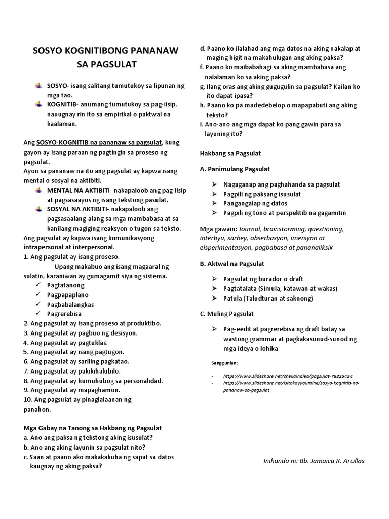 Sosyo-kognitibong pananaw sa pagsulatlipunanpagsulatlipunanang mga ideyang ating inilalahad sa pagsulat ay nakukuha sa lipunan at sadyang dito rin natin ipinatutungkoldepinisyonsosyokognitiboito ay ang lipunang ating ginagalawanang ating isipan at kaalamanprosesong sosyo-kognitiboprosesong sosyo-kognitibo tayo ay susulat upang. Ito ay maaaring maging kritikal na sanaysay lab report eksperimento konseptong papel term paper o pamanahong papel thesis o disertasyonItinuturing din itong isang intelektwal na pagsulat dahil layunin nitong pataasin ang antas at kalidad ng kaalaman ng mga estudyante sa paaralanMga Uri ng Pagsulat. Binibigyang-diin din ng metakognisyon ang malawakang control sa - Paglilinang ng talasalitaan.