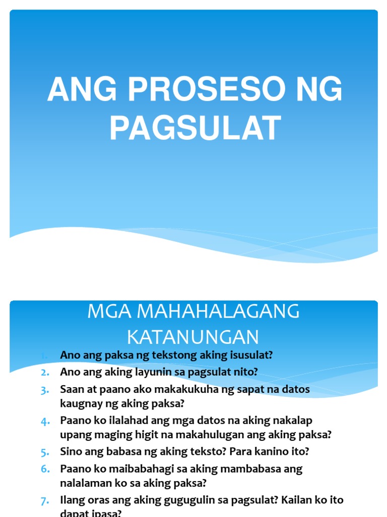 MGA PROSESO SA PAGSULAT AT PANANALIKSIK MGA PROSESO SA PAGSULAT AT PANANALIKSIK 1. Start studying Proseso ng Pagsulat. Pagsulat ng burador at pagwawasto 8.